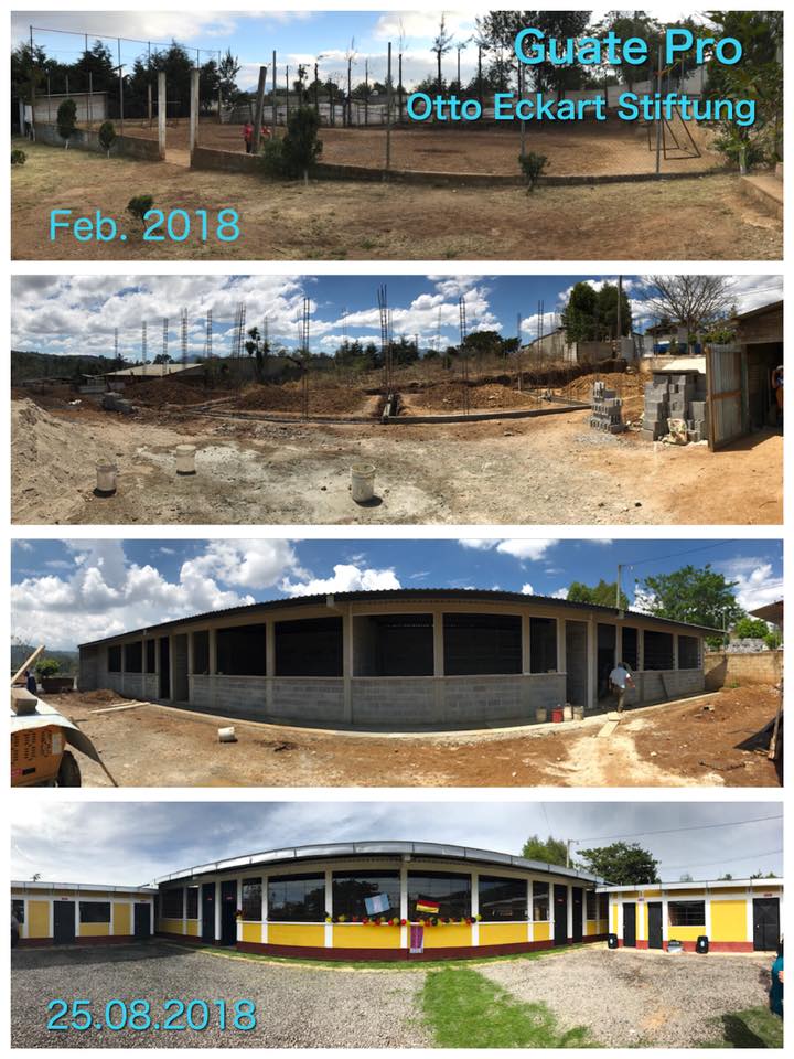 Die Direktorin, Frau Miriam Raquel Paulich Sequén, der o.g. Schule hat Guate Pro den Antrag für den Bau von vier Klasseräumen, Toiletten, Küche, Lagerraum und Lehrerzimmer für die Kindergarten- und Vorschulkinder bereits schon 2015 gestellt. Damals hat der Verein den Antrag auf die Warteliste gestellt. Im November 2017 hat die Direktorin mit Ehepaar Schlemmer, unser Partner vor Ort, und Don Rosendo, unser Baumeister in Guatemala Gespräche geführt und ihren Antrag nochmals präsentiert. Die Platzmangelsituation der Schule hat sich seitdem verschlechtert, da die Kinderzahl von 100 auf 150 gestiegen ist. Seit dem ersten Antrag bei Guate Pro hat das Schulministerium nichts verbessert. Deshalb haben sich die Lehrer, Eltern der Kinder sowie die aktuellen Mitglieder der Cocode und der Bürgermeister zusammen gesetzt und entschieden die Baumaterialien für die 4 Klassenzimmer zu spenden. Außerdem hat die Stiftung Otto Eckart aus München Don Rosendo den Prix International Pour Les Enfants in Höhe von 10.000 € überreicht, der zweckgebunden für dieses Projekt ist. Guate Pro hat Dezember 2017 dieses Geld bereits erhalten.